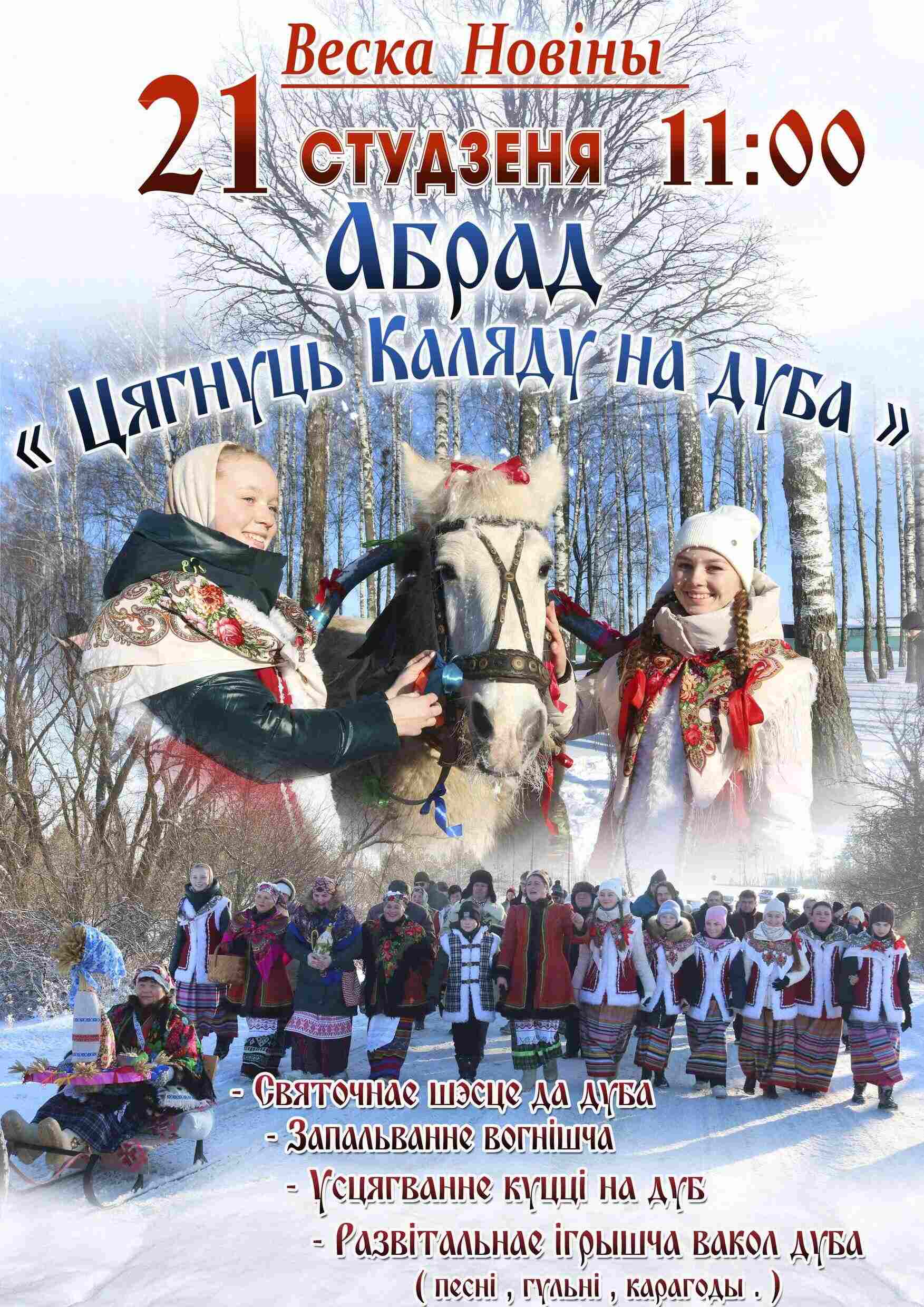 Запрашаем усіх жадаючых ў вёску Новіны, каб акунуцца ў атмасферу беларускіх народных традыцый і прыняць удзел у старажытным абрадзе “Цягнуць Каляду на дуба”!